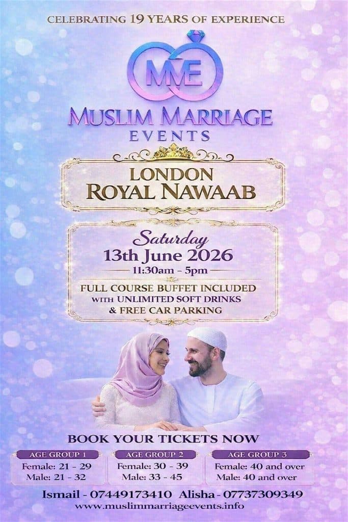 We are holding the next Muslim Marriage Events London – 3 Age Groups at the prestigous Royal Nawaab, 7 Hoover Building Western Ave, Perivale, London UB6 8DB on Saturday 13th June 2026 Open to male and female’s who are British Passport Holders between the ages of Group 1 – Females 21 – 29 & Males 21 – 32 Group 2 – Females 30 - 39 & Males 33 - 45 Group 3 - Females 40 & Over and Males 40 & Over You must be fully Divorced, Widowed or Single to attend our events Please call Alisha on 07737309349 or Ismail on 07449173410 if you wish to pay by Card/Bank Transfer over the phone